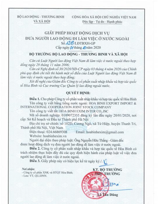 Giấy phép hoạt động dịch vụ đưa người lao động đi làm việc ở nước ngoài theo hợp đồng